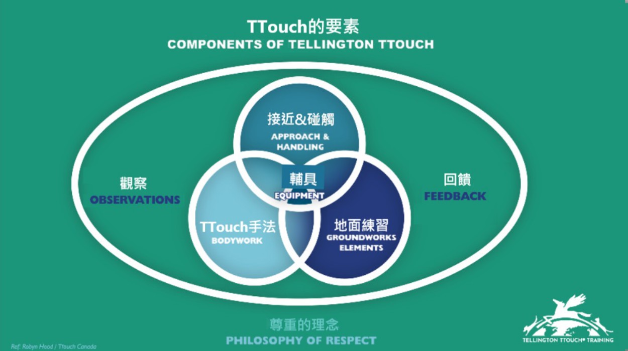 TTouch結合特定的撫觸手法、輔具與簡單的移動練習,核心理念是尊重每個個體的獨特性,不使用恐懼或暴力,支持動物展現最好的自己。